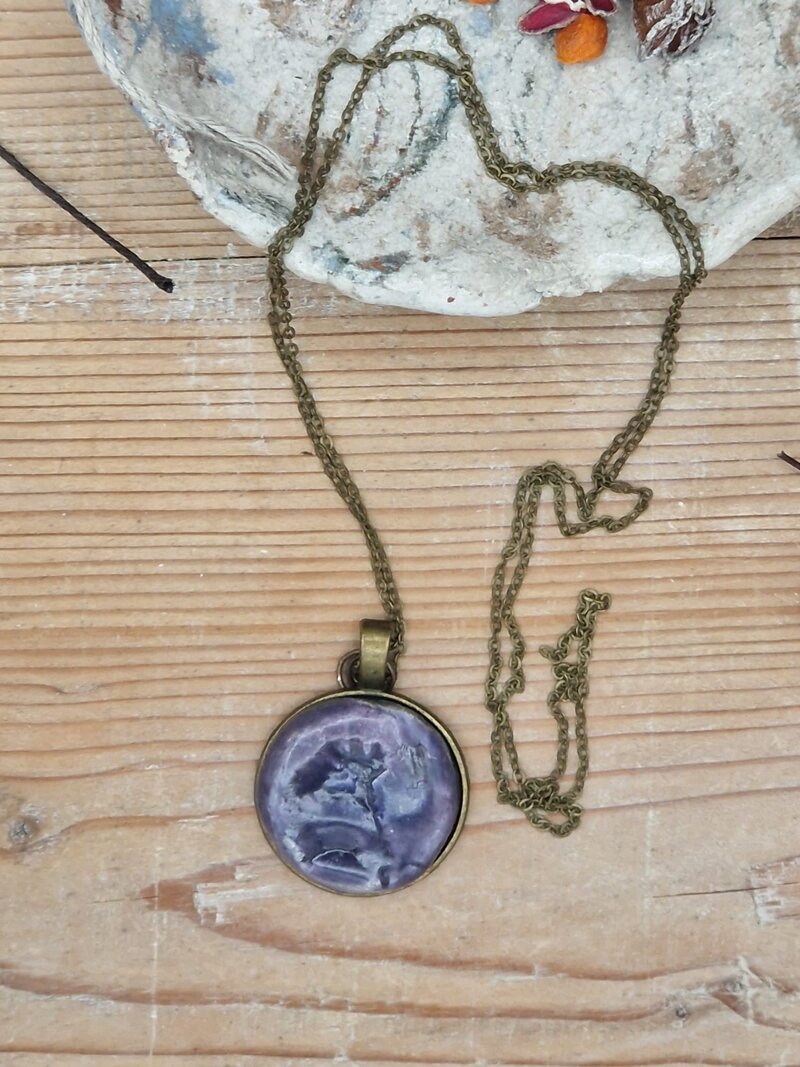 Presentiamo la nostra collana con ciondolo in ceramica raku, disponibile in varie forme, rifinita da una base e catena in ottone anticato. Ogni ciondolo è realizzato a mano, rendendo