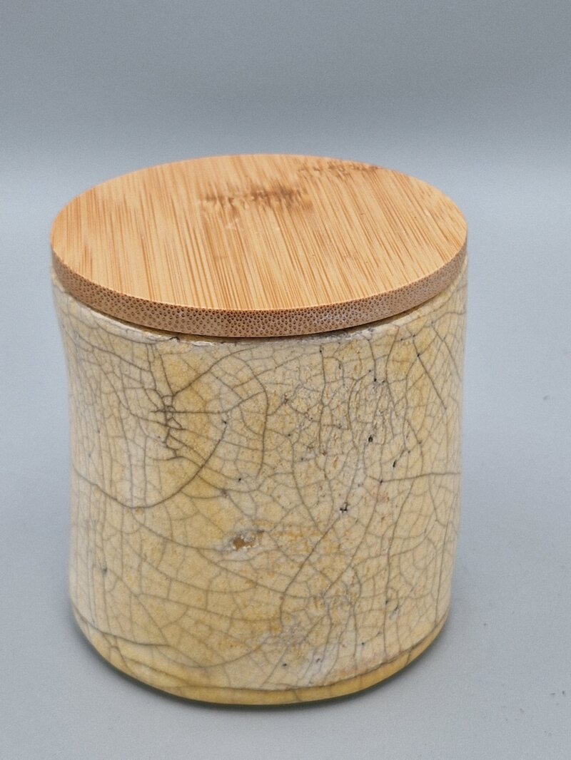 Materiali: contenitore in ceramica Raku, Coperchio in legno, Guarnizione in silicone.