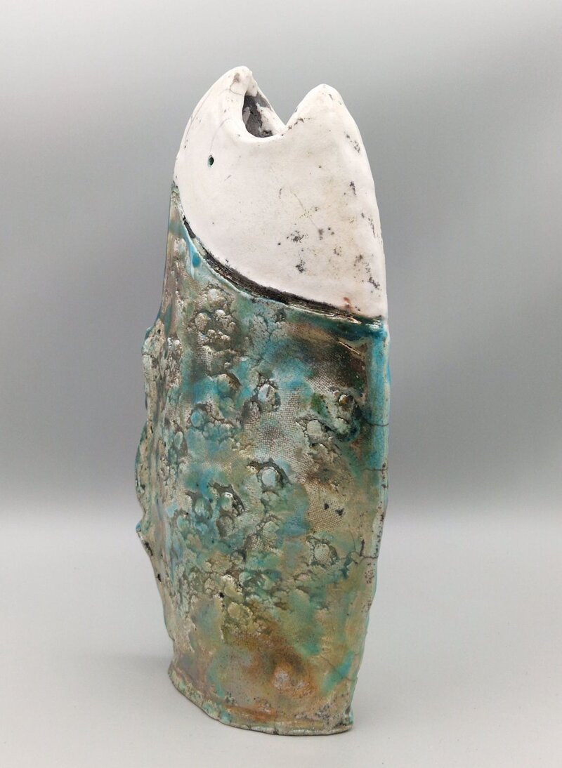 Questo vaso a forma di pesce, realizzato in ceramica Raku, è
